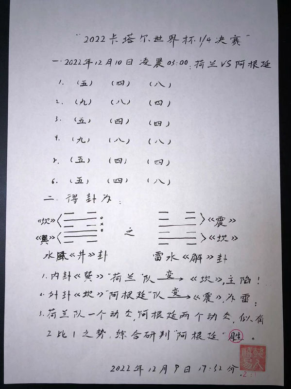 二、2022年12月9日17:32分,嚴格根據周易《大衍筮法》預測:12月10日凌晨03:00”荷蘭隊 VS 阿根廷隊“。得卦水風《井》之雷水《解》卦,九三、六四動爻。以本卦之內卦(下卦)《巽》卦對應“荷蘭隊”;以外卦(上卦)《坎》卦對應“阿根廷隊”。變卦,荷蘭隊由《巽》變《坎》;阿根廷隊由《坎》變《震》,故《坎》、《震》二卦對比,坎主險也,震更勝一籌。據此,判斷“阿根廷——勝!”果驗。“比分”預測不準!