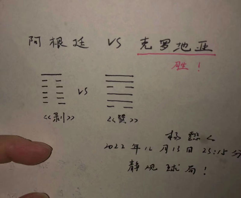 三、2022年12月13日晚23:26分,發布的朋友圈:“阿根廷隊 VS 克羅地亞隊”。當時,我根據“海派奇門”王志峰老師學生曹女士所發布的有關比賽預測信息發布的“時間”, 直接以《剝》卦對應“阿根廷隊”,而以《巽》卦對應“克羅地亞隊”,據此判斷預測克羅地亞隊“勝”。事實證明,預測結果是錯誤的!沒有按照周易“大衍筮法”的既定要求規矩來“揲筮”、“得卦”、“占斷”,故與其真實結果相去甚遠!同時,提醒了自己,再也不能如此草率胡亂截取“時間”數字來直接對應六十四卦“吉兇”來做對比分析和預測結論。(另外,那晚也是剛陽后第三天,頭腦還是不清醒,有高強度背書,還喝了兩瓶啤酒···)