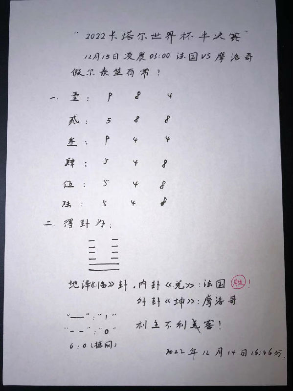 四、2022年12月14日16:46分,發布朋友圈預測:“12月15日凌晨3點,法國隊 VS 摩洛哥隊“。嚴格采用周易《大衍筮法》步驟要求方法,得地澤《臨》卦,以內卦《兌》卦對應”法國隊,以外卦《坤》卦對應”摩洛哥隊“,據此,判斷”法國隊勝“,果驗!然而,比分根據網上流傳的所謂”八卦序數“(坎2、艮1)并不對應,所以預測并非真實地情況”2 : 0“。