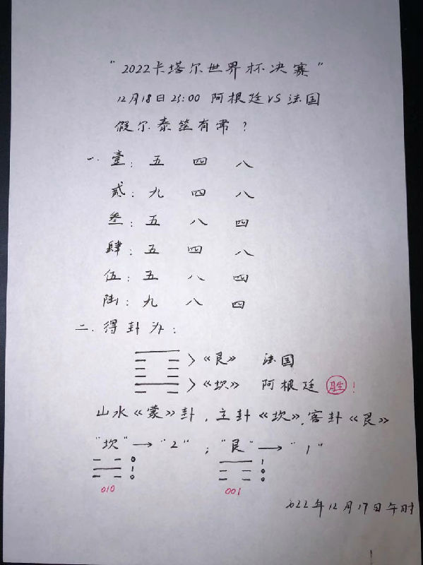 五、2022年12月17日午時,發布朋友圈預測:”12月18日23:00阿根廷隊 VS 法國隊“。同樣,嚴格運用《大衍筮法》進行揲筮預測,得卦山水《蒙》卦,以內卦《坎》卦對應阿根廷隊,以外卦《艮》卦對應法國隊。據此,判斷”阿根廷隊勝“,應驗!”比分“仍然沒有預測準確。
